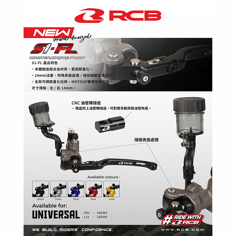 【RCB】中階款 S1-FL直推總泵 - 14mm 左/右手皆可對應,提升剎車手感必改,皆附透明油杯、油壓剎車開關,可折式拉桿,角度多段可調。